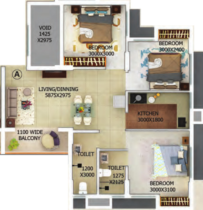 Floor Plans of 3BHK(762sq.ft.)