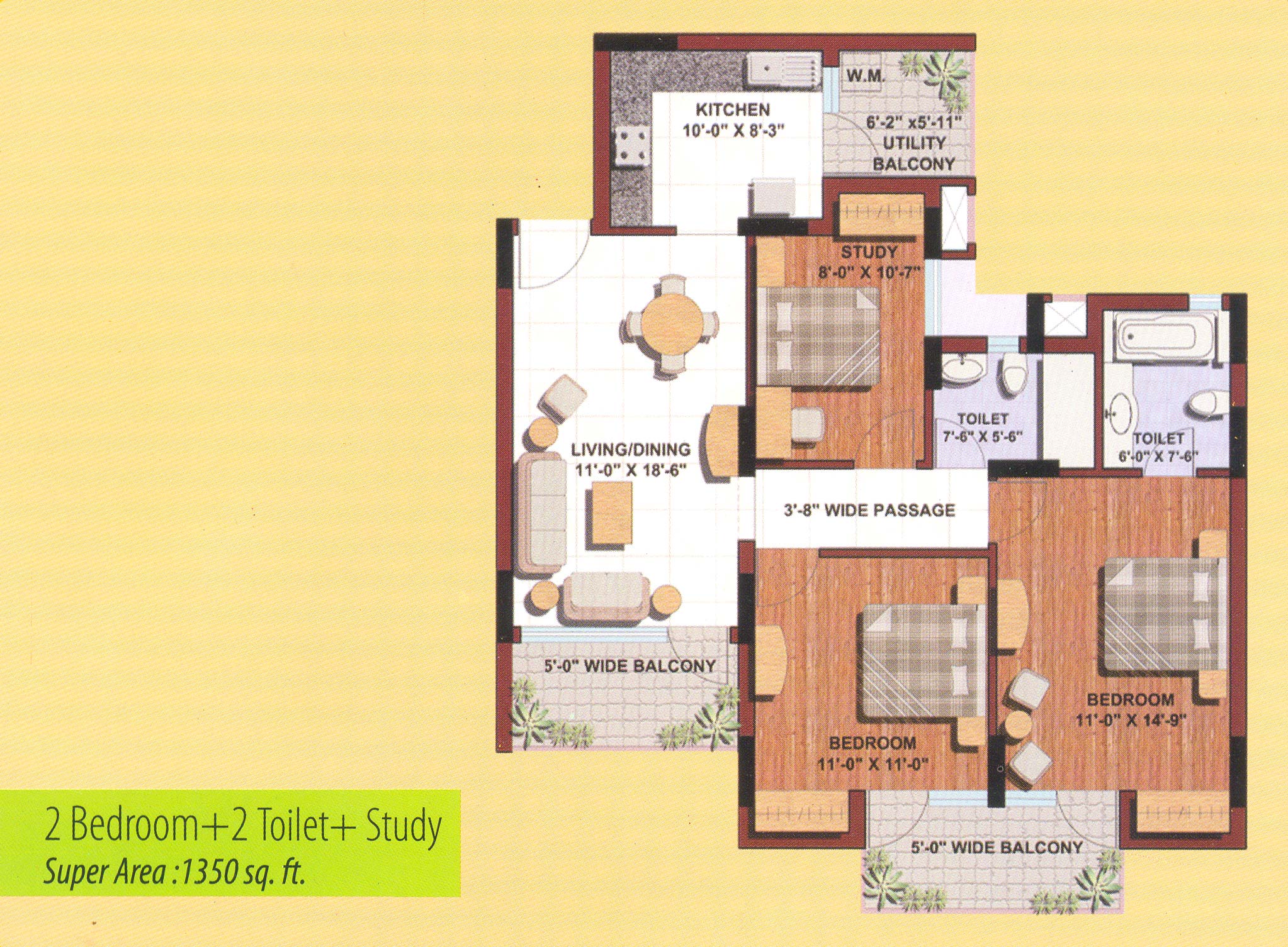 Floor Plans of 1350 sqft-2BHK,2T,2S